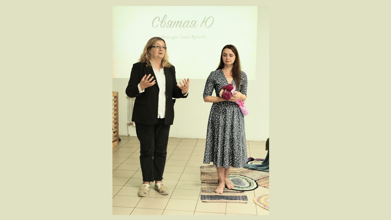 Diesmal begann ich die Aufführung mit den folgenden Worten: „Vor 84 Jahren wurde die Familie Wigel, Heinrich und Julianna, mit ihren Kindern in die Region Altai deportiert. Das waren mein Urgroßvater und meine Urgroßmutter. Und vor 36 Jahren wurde ein Mädchen namens Olga geboren. Und das Mädchen wurde von meiner Urgroßmutter Julianna aufgezogen. Dem Schriftsteller Puschkin erzählte in seiner Kindheit Märchen Arina Rodionowna, und mir erzählte Märchen meine Urgroßmutter. Nur waren das keine Märchen, es war eine Geschichte, die wirklich passiert ist. Und jetzt ist das Mädchen erwachsen geworden und arbeitet seit 15 Jahren als Schauspielerin am Altai-Jugendtheater. Und 2021 fand die Premiere des Stücks „Heilige Ju“ statt. Dieses Stück handelt von meiner Familie, von Liebe und der Kraft des Volkes...“