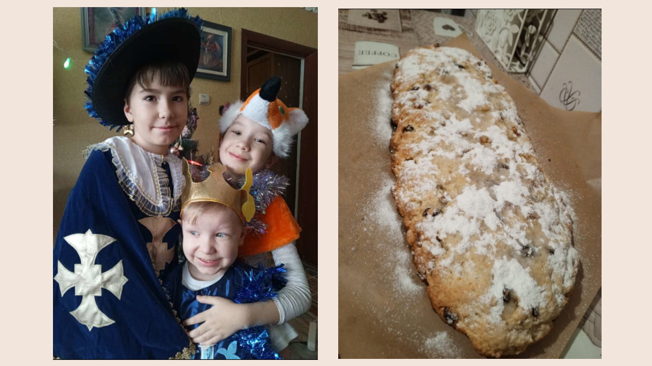 Ich habe drei Kinder, und natürlich pflegen wir deutsche Familientraditionen, die unser Zuhause mit Wärme und Liebe erfüllen. In der Vorweihnachtszeit stellen wir nicht einfach nur einen Weihnachtsbaum auf und schmücken das Haus – es ist eine Zeit besonderer Vorfreude und Freude. Am 1. Dezember hängen wir einen Familien-Adventskalender auf, den ich selbst genäht habe. Es ist ein gemütliches Häuschen mit 24 Taschen, die jeweils mit kleinen Leckereien gefüllt sind – so zählen wir die Tage bis zum lang ersehnten Weihnachtsmorgen. Jede Woche zünden wir eine der vier Kerzen an, die die einzelnen Phasen des nahenden Festes symbolisieren und unseren Glauben und unsere Hoffnung stärken. Und zu Weihnachten backe ich mit viel Liebe einen traditionellen deutschen Stollen – aromatisch, süß und geschichtsträchtig, wird dieser Kuchen zu einem wahren Symbol des Festes in unserem Zuhause.